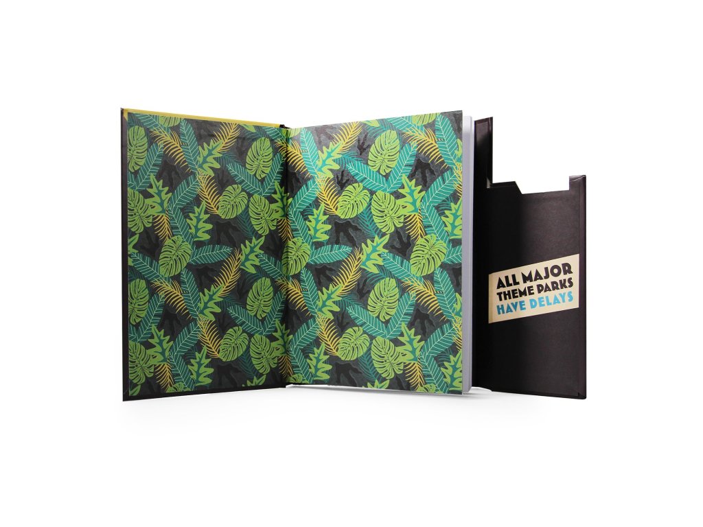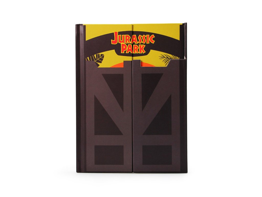 A Jurassic Park dizájnú füzetekbe mindent felírhatsz, amit a vadonban látsz. A Jegyzetfüzet mágneses zárat tartalmaz, amely a Jurassic Park főkapujára emlékeztet.