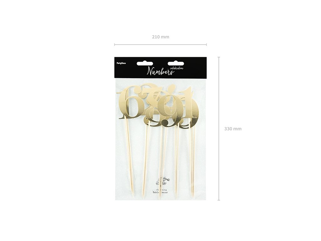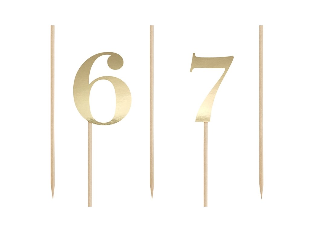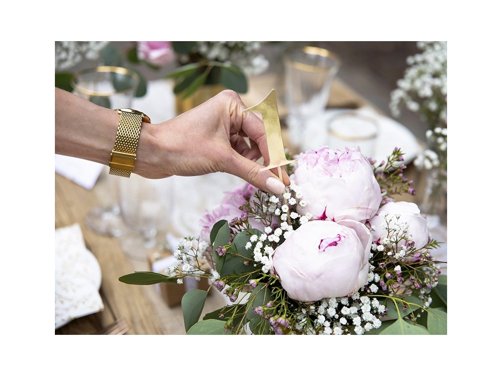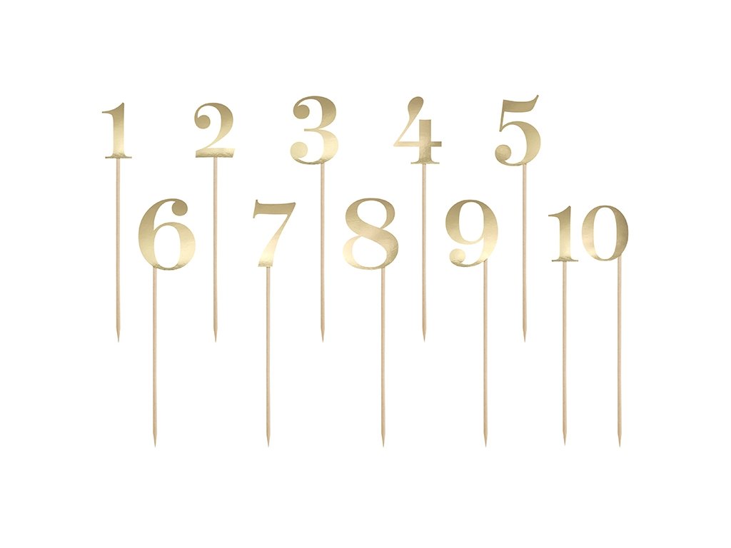Papírkarton arany számok pálcikán. Esküvői asztal számozásához alkalmas. Elegáns kiegészítő az ünnepi asztalon.
