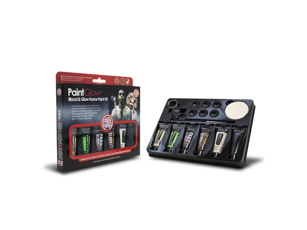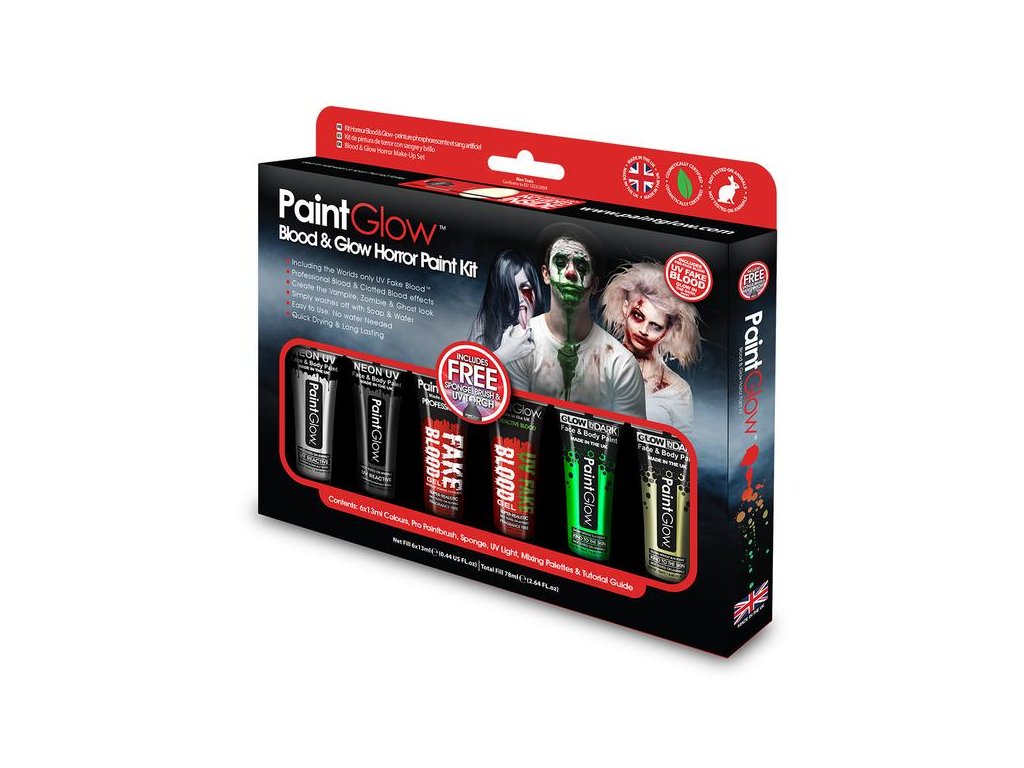 Szeretne halloweenra horror sminket készíteni? Próbálja ki ezt az arcra vagy testre könnyebb felvitelt lehetővé tevő, szivacsot és ecsetet tartalmazó festék szettet. A szett UV fény alatt világító, 4 különböző színt, valamint zöld és piros művért tartalmaz. A festékek arcra vagy testre történő festésre alkalmasak. Dermatológiailag teszteltek, ezért a bőrét nem kell féltenie. A termékek Nagy Britanniában készültek és azokat állatokon nem tesztelték.