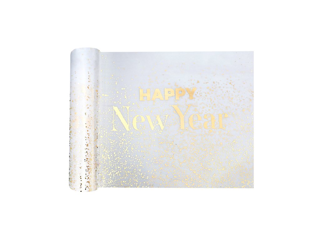 Minden ünnepséghez hozzá tartozik a terítek. Ez az ünnepi Happy New Year feliratú asztali futó tökéletes egy szilveszteri partihoz.