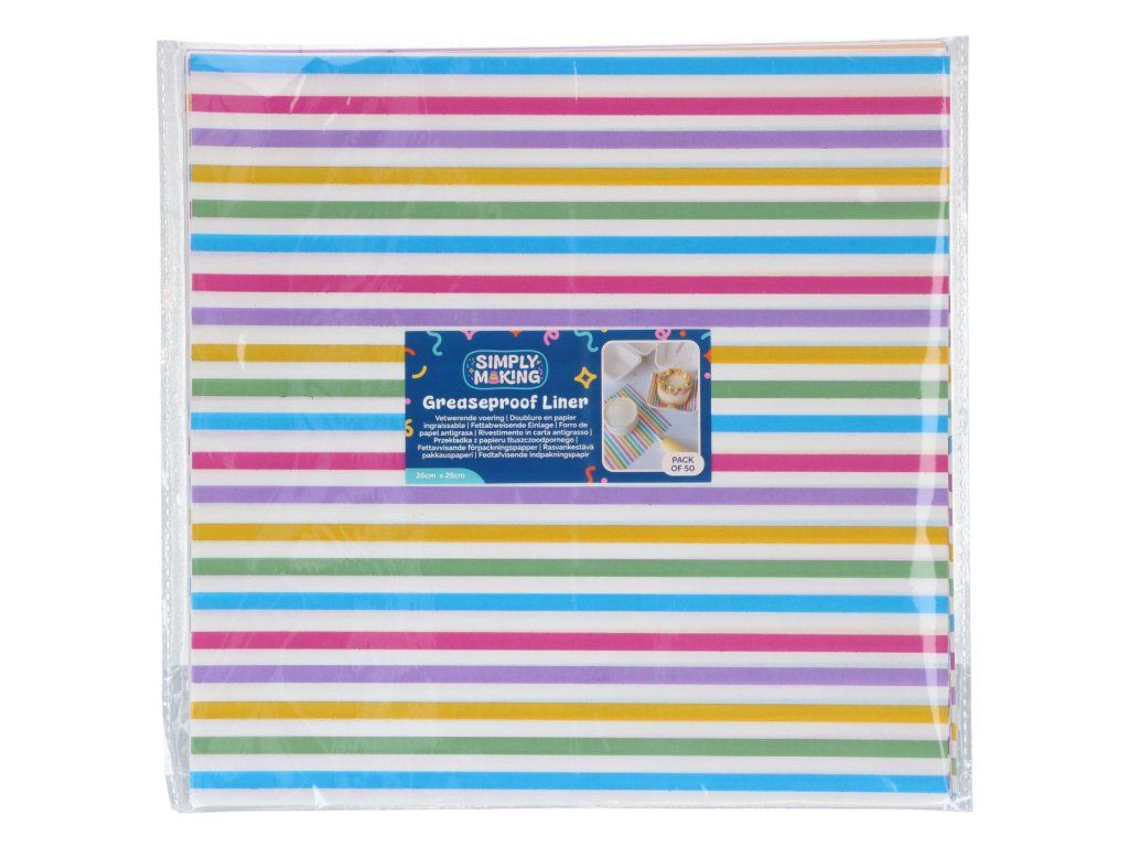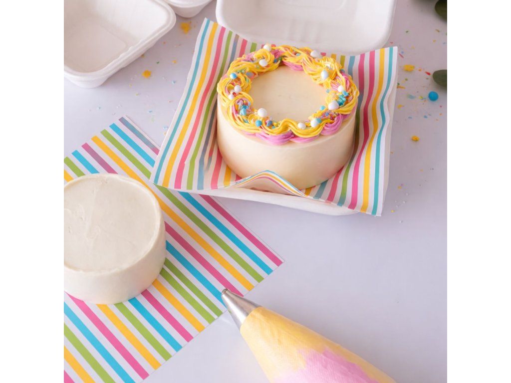 Praktikus és stílusos bélés papír színes Rainbow Stripes mintával, amely tökéletes cukrászdobozokhoz, sütemények, édességek és édes ajándékok csomagolásához, de akár szendvicsekhez is. Vidám, csíkos dizájnjának köszönhetően minden csomagolásnak modern és vonzó megjelenést kölcsönöz.