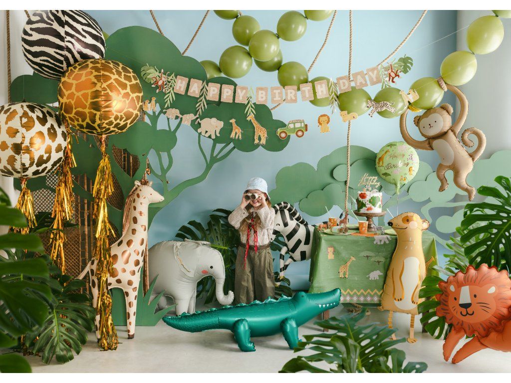 Stílusos és játékos dekoráció, amely tökéletes születésnapi hangulatot teremt. A készlet tartalmaz egy bézs színű, „Happy Birthday” feliratú bannert levelekkel és majmokkal díszítve (hossza 180 cm), valamint egy szafari motívumokkal ellátott girlandot (hossza 180 cm). Mindkét rész aranysodronnyal van összekötve, teljes hossza körülbelül 280 cm. A banner azonnal, közvetlenül a csomagolásból használatra kész, és egyedi dizájnja miatt ideális gyerekzsúrokra, tematikus bulikra vagy családi összejövetelekre.