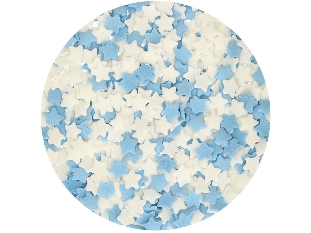 A kék és fehér csillagok olyan cukrászati díszítő elemek, amelyek nagyon jól mutatnak tortákon, süteményeken, donuts - on, cupcake - en vagy más desszerten téli vagy karácsonyi témával. Ehető ragasztóval, glazúrákkal vagy csokoládéval rögzíthetők.
