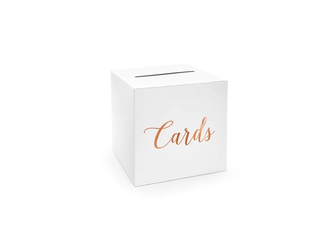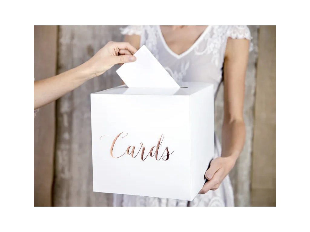 Ez a doboz a borítékoknak vagy a pénznek nem csak kiegészíti a dekorációt, hanem segít elhelyezni a kis figyelmességet a vendégektől. A dobozt rózsaszín -arany Cards felirat díszíti. Egyszerűen össze kell hajtani a dobozt, és jól látható helyre kell tenni az esküvőn.