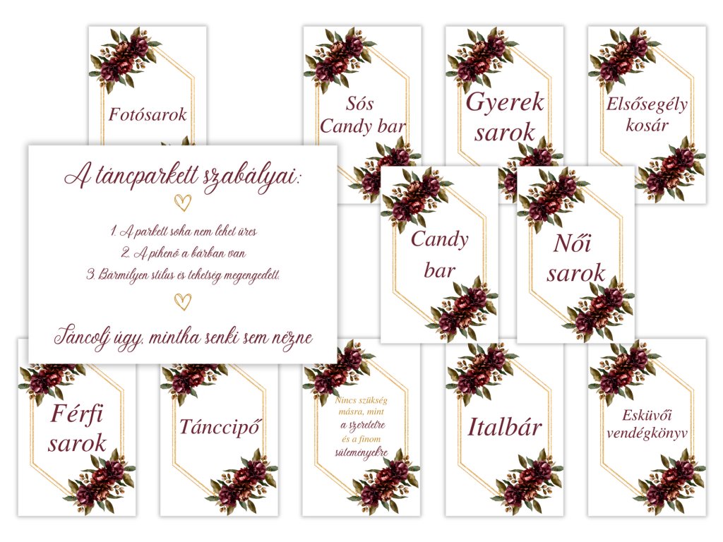 Jelölje meg nagy napjának minden fontos pillanatát esküvői információs kártyáinkkal! Elegánsan és egyszerűen készítsen stílusos jelöléseket candy bar, fotó sarok és más kulcsfontosságú helyekhez. Dizájnok széles választéka lehetővé teszi, hogy minden kártyát az Ön elképzelései és színsémái szerint szabjon testre. Könnyedén és stílusosan tudassa vendégeivel, hogy hol tartanak az esküvői fogadás egyes részei. Információs kártyáinkkal minden pillanatot elegancia és precizitás jellemez.