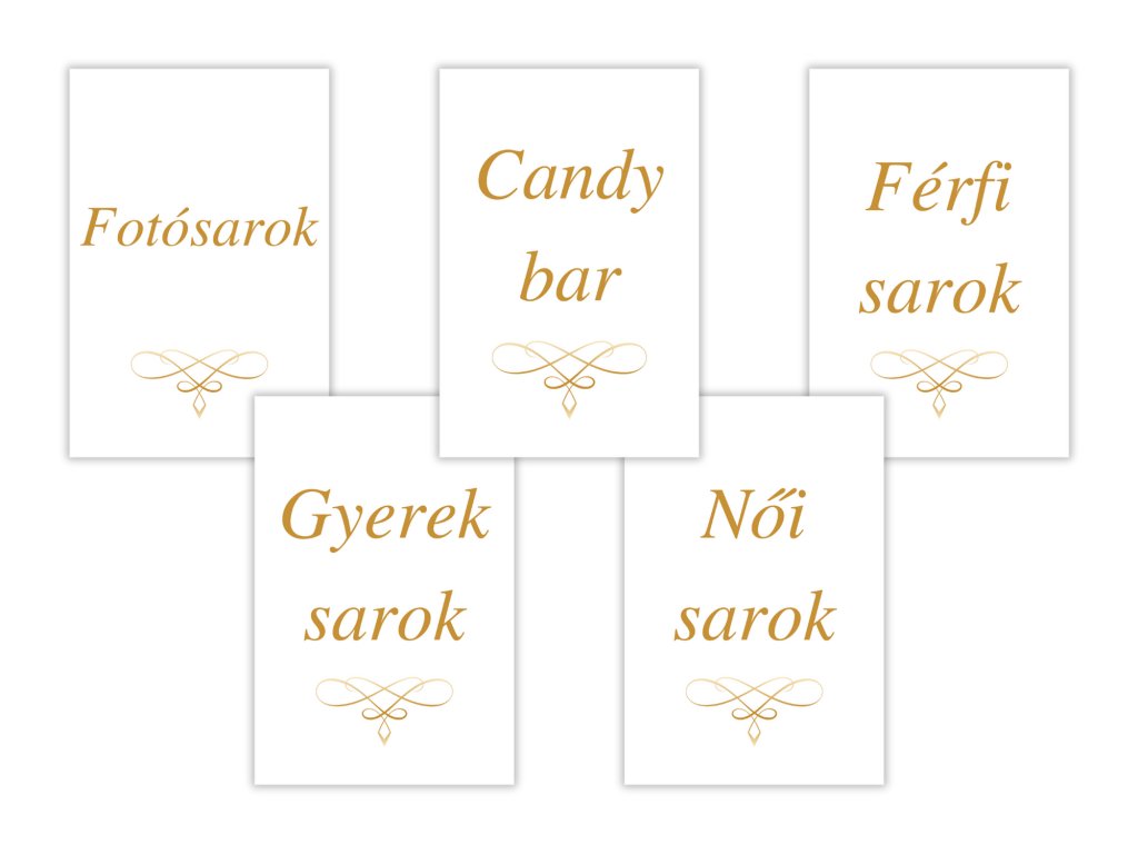 Jelölje meg nagy napjának minden fontos pillanatát esküvői információs kártyáinkkal! Elegánsan és egyszerűen készítsen stílusos jelöléseket candy bar, fotó sarok és más kulcsfontosságú helyekhez. Dizájnok széles választéka lehetővé teszi, hogy minden kártyát az Ön elképzelései és színsémái szerint szabjon testre. Könnyedén és stílusosan tudassa vendégeivel, hogy hol tartanak az esküvői fogadás egyes részei. Információs kártyáinkkal minden pillanatot elegancia és precizitás jellemez.