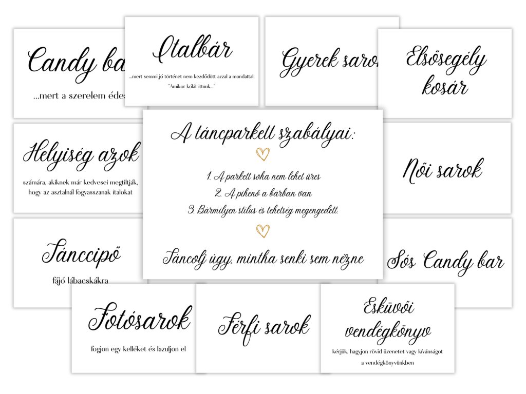 Jelölje meg nagy napjának minden fontos pillanatát esküvői információs kártyáinkkal! Elegánsan és egyszerűen készítsen stílusos jelöléseket candy bar, fotó sarok és más kulcsfontosságú helyekhez. Dizájnok széles választéka lehetővé teszi, hogy minden kártyát az Ön elképzelései és színsémái szerint szabjon testre. Könnyedén és stílusosan tudassa vendégeivel, hogy hol tartanak az esküvői fogadás egyes részei. Információs kártyáinkkal minden pillanatot elegancia és precizitás jellemez.
