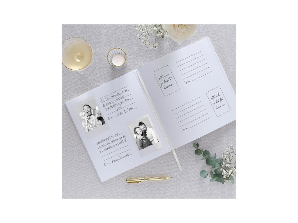 Teremtsen emléket esküvőjének napjáról ezzel az elegáns fotókönyvvel a vendégek számára. Az esküvői könyv alkalmas fényképek beszúrására és szívhez szóló, szép, de vicces üzenetek megosztására a menyasszony és a vőlegény számára.