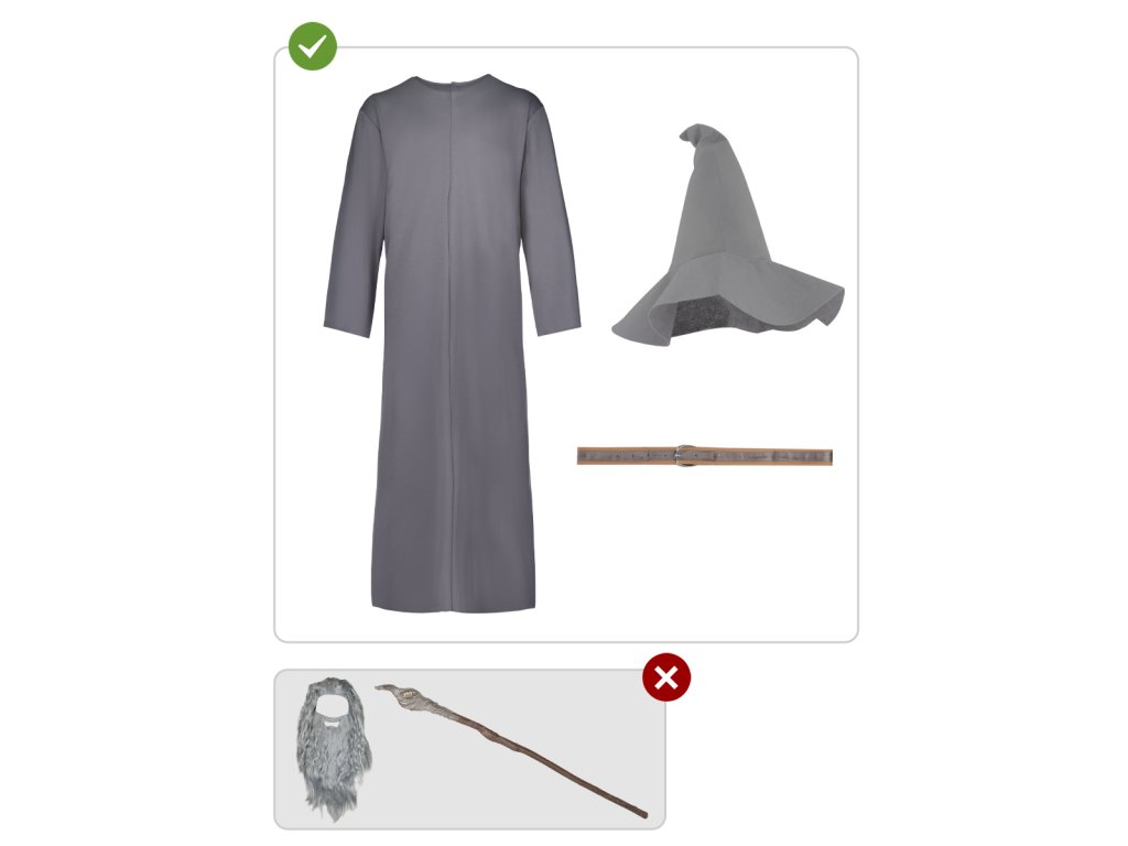 Figyelem, ez a jelmez nem tartalmazza a szakállat, pálcát és parókát – mert a valódi Gandalf maga találja meg a kiegészítőit! Készüljön fel a kalandra, amely Önre vár, és ne feledje: "Hagyja, hogy a fény vezesse, még akkor is, ha minden más sötétben van!"