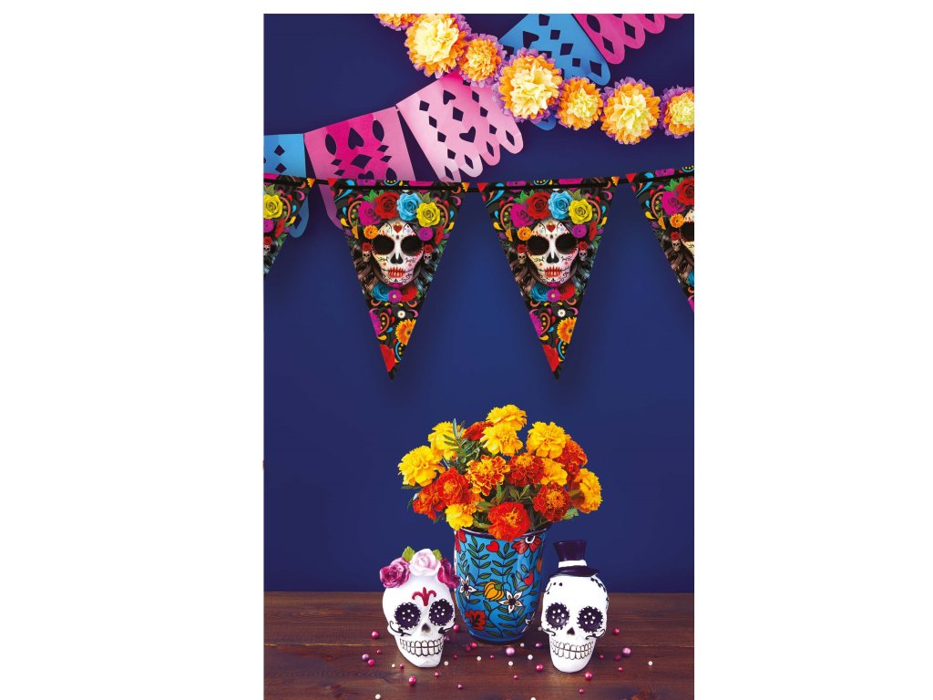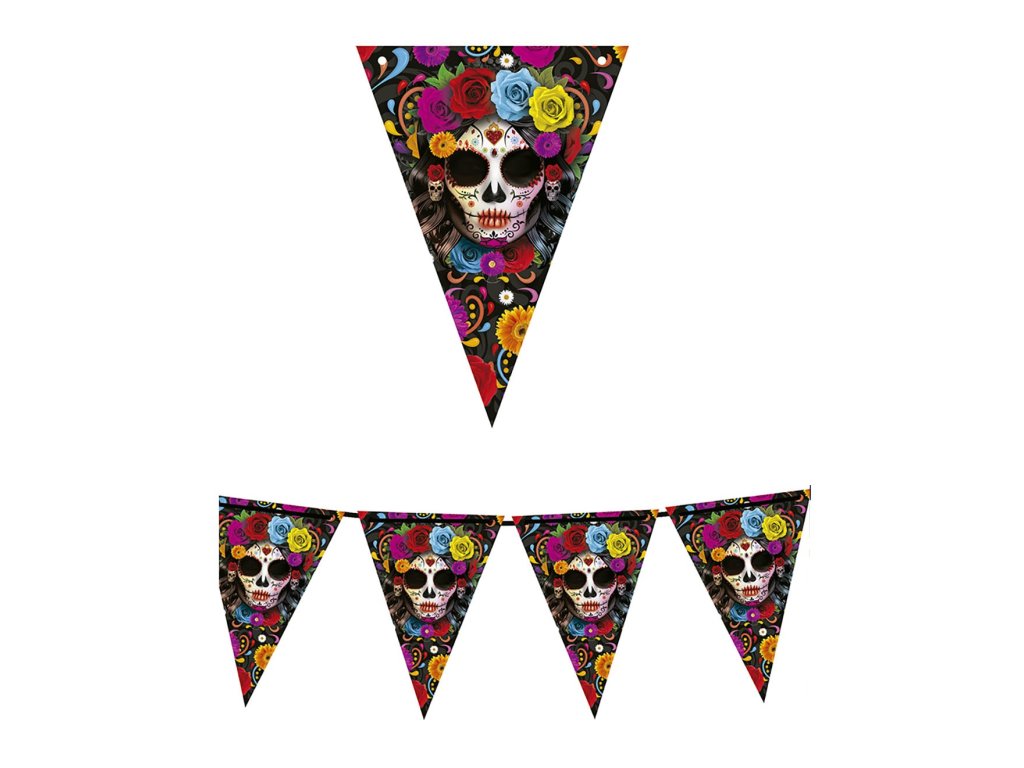 Egyetlen Halloween partiról sem hiányozhat ez a Catrina motívumú girland . Készítsen felejthetetlen Halloween díszítést eredeti Halloween dekorációinkkal.