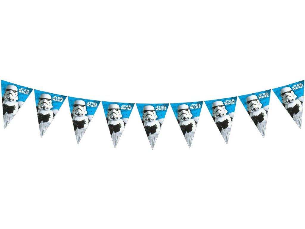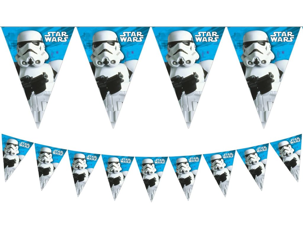 A Csillagok háborúja (Star Wars) motívumú girland segíthet a party díszítés kialakításában. Enélkül egyetlen születésnapi ünnepség sem kerülhet megrendezésre. Ez a színes party dekoráció Star Wars témájú gyerek születésnapi ünnepségre vagy gyerekzsúrra alkalmas.