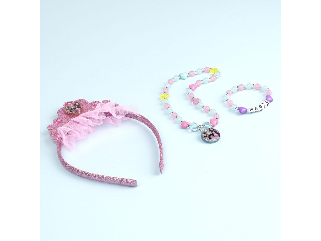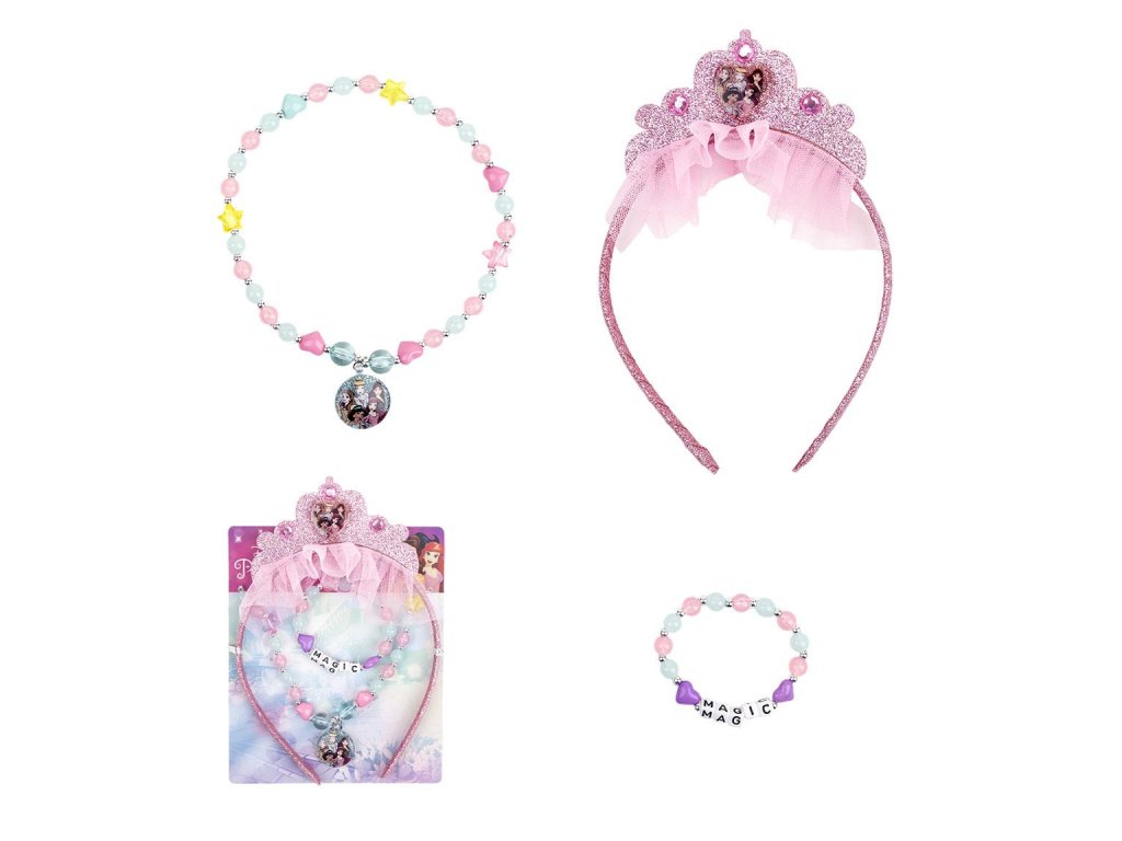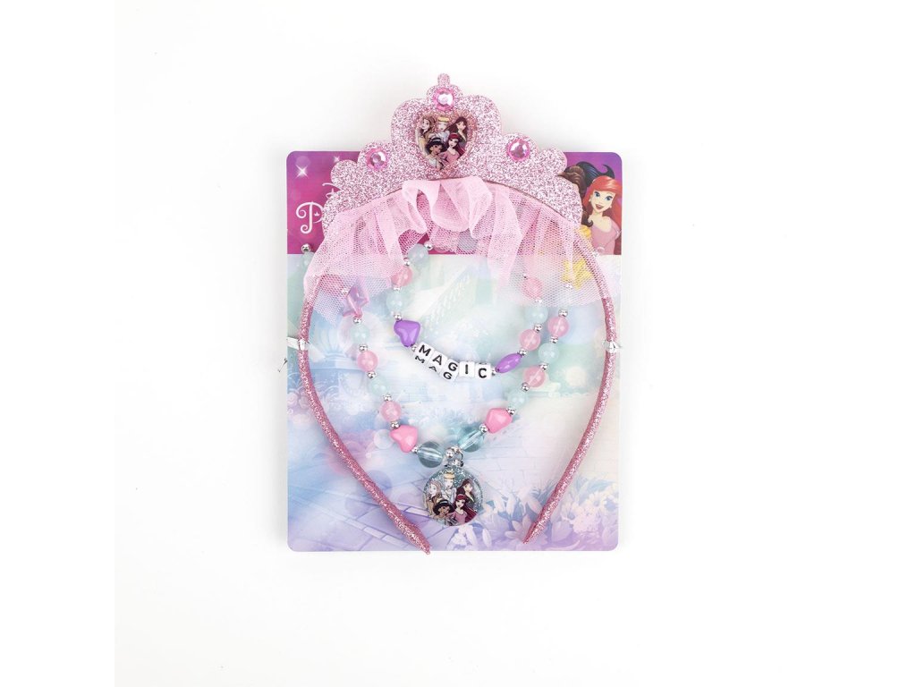 A gyerek szett ékszereket tartalmaz kislányok számára. A szett tartalmaz fejpántot, nyakláncot és karkötőt Disney Hercegnők motívummal.