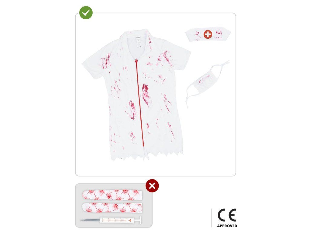 A csomag tartalma egy realisztikus „zombi” dizájnú ruha, valamint egy egészségügyi keresztes fejpánt