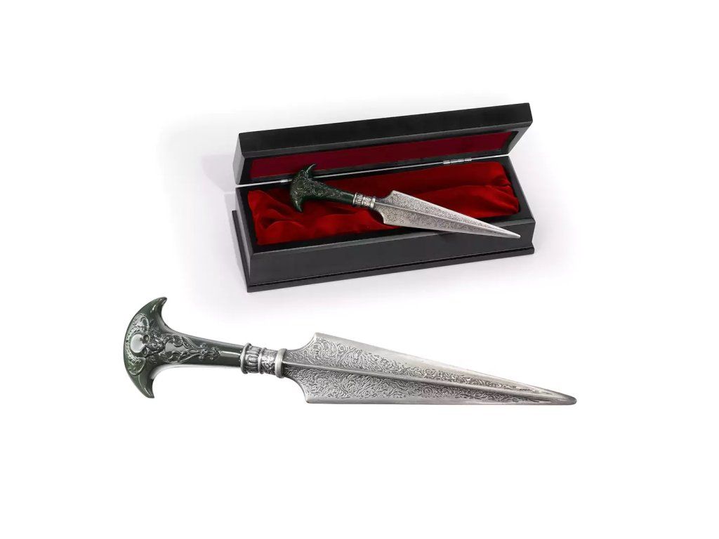 Bellatrix Lestrange tőrének másolata a Harry Potter filmvilágából remek gyűjtői tárgy a sötét mágia rajongóinak. A tőr gondosan kidolgozott, részletgazdag pengével és dekoratív nyéllel rendelkezik, amely megragadja ennek a lenyűgöző figurának a jellegzetes stílusát.