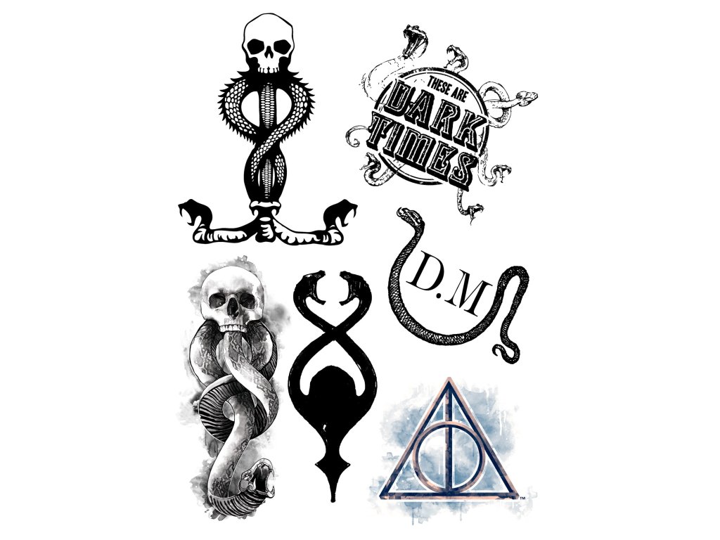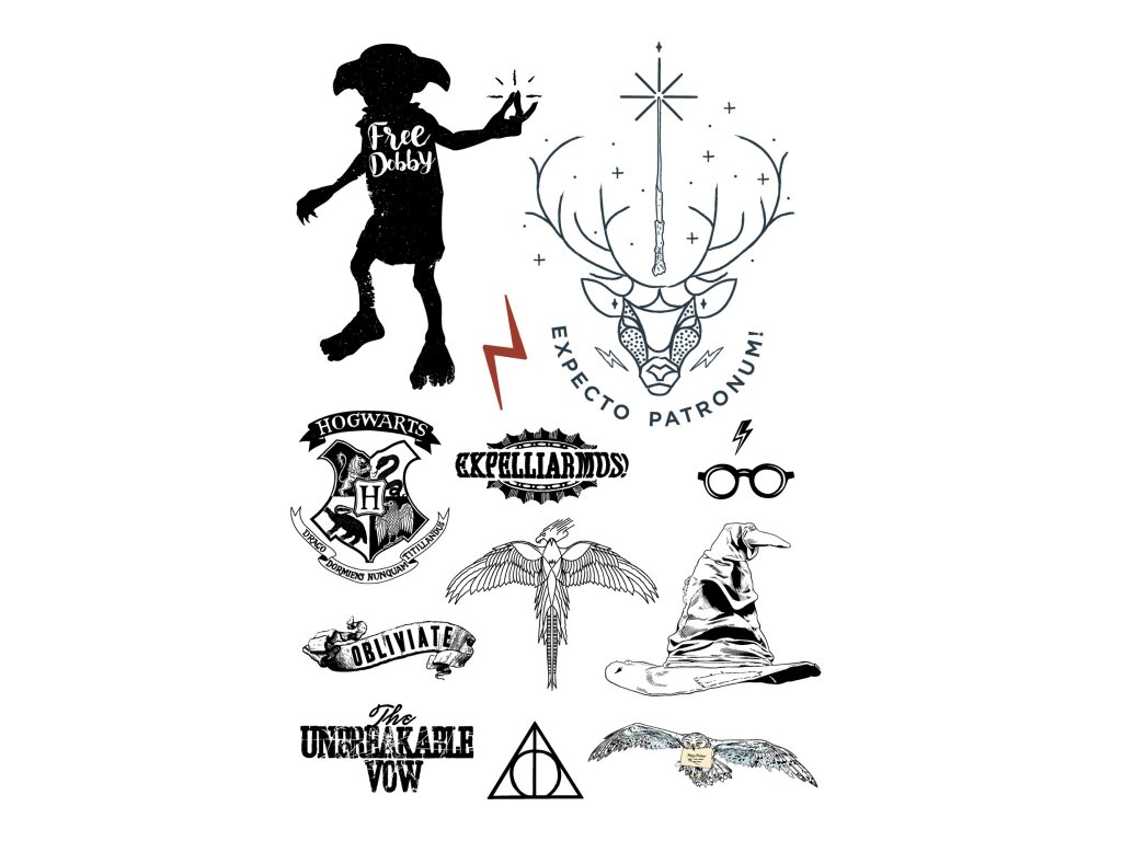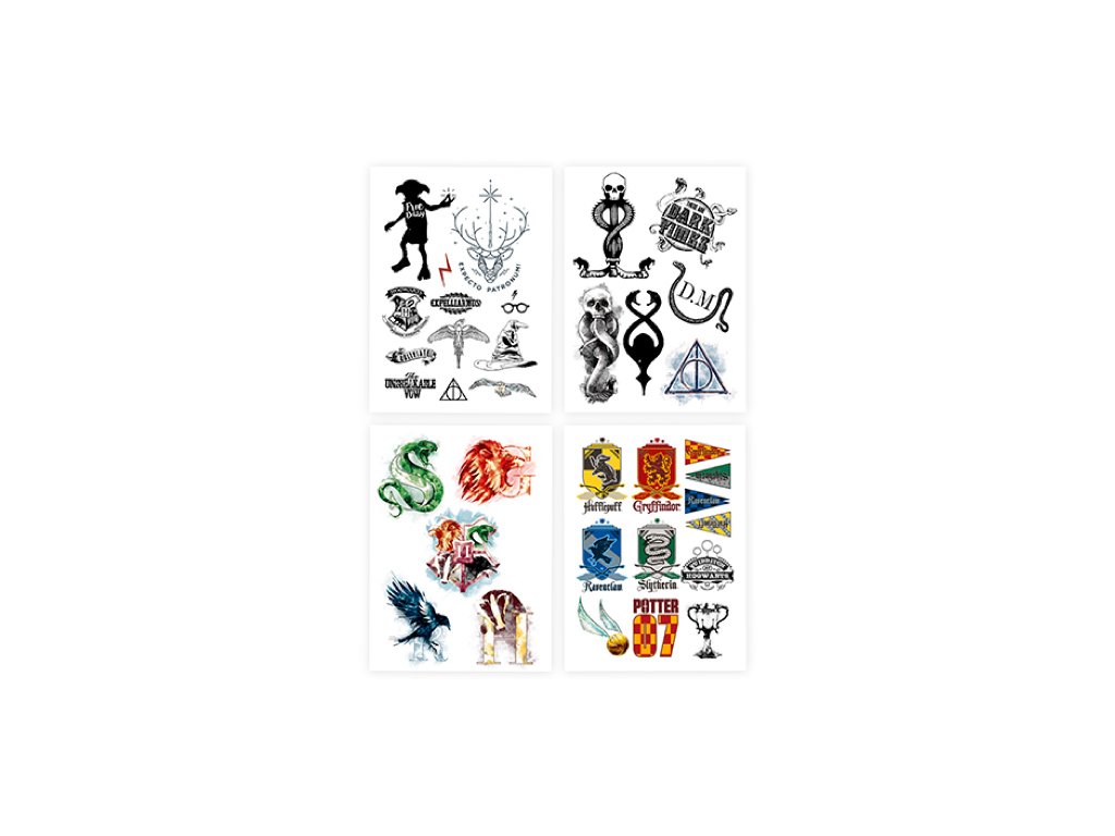 Ezek a tetoválások elengedhetetlen kiegészítői bármilyen Harry Potter témakörben rendezett ünnepségnek. A négy különböző stílusú palettából az öltözékéhez illőt tudja kiválasztani. A hazaszeretetét kinyílváníthatja, ha a vállán fogja viselni a házának a címerét, vagy Harry Potternek érezheti magát, ha a heget a fején fogja viselni.