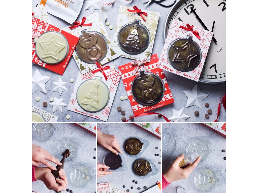 Különleges karácsonyi csokoládé tallér forma. Készítsen finom csokoládéval töltött képeslapokat és díszítse velük a karácsonyi ajándékokat. Ajándékozzon karácsonyra eredeti kézzel készített ajándékokat. A csokoládé képeslapokat használhatja ünnepi dekorációként is, de akár a karácsonyfát is díszítheti velük.