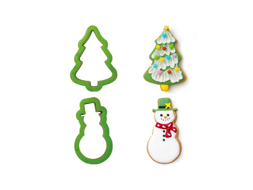 A karácsonyi kiszúró készlet 2 féle formát tartalmaz: karácsonyfát és hóembert. Használhatja linzer, mézeskalács vagy teasütemények készítéséhez. Marcipán, fondant vagy más modellező anyag kiszúrására is alkalmas. A kész süteményekkel díszítheti az ünnepi asztalt vagy a karácsonyfát.