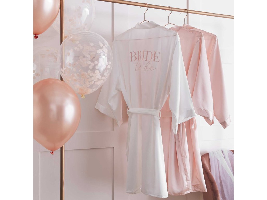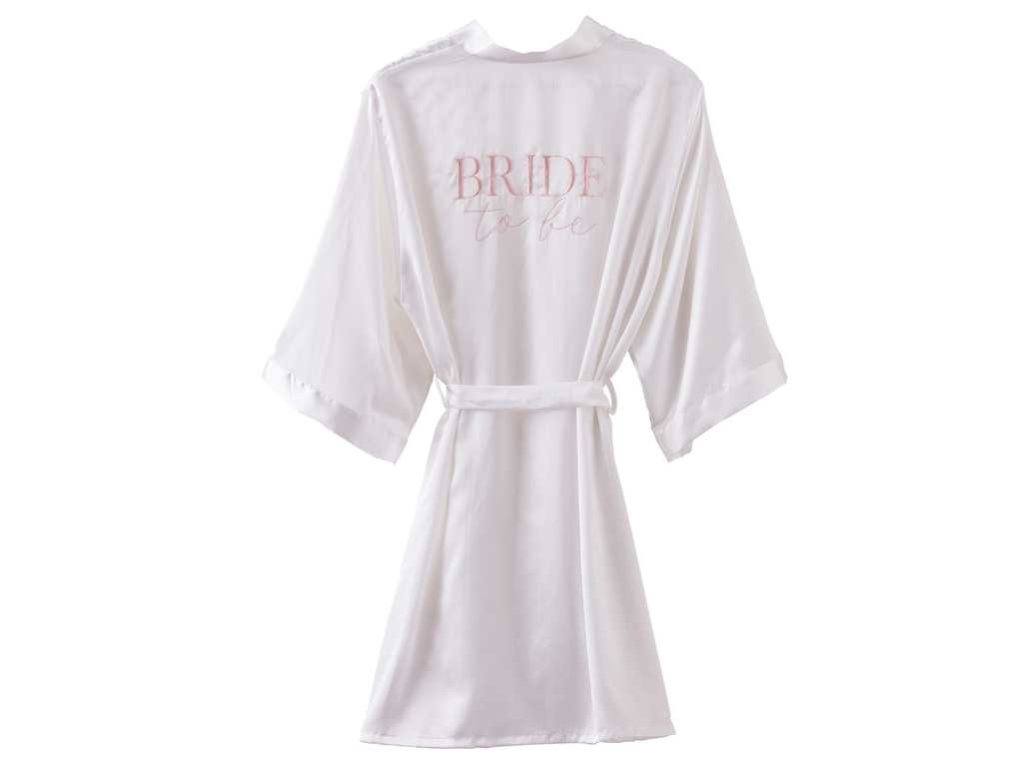 Ragadja meg az alkalmat mert ebben a kimonóban egy nagyszerű lánybúcsút fog ünnepelni. A luxus fehér kimonó hátulján „Bride to be“ felirat található, és a mellékelt övvel könnyedén megkötheti. A lánybúcsú mellett a kimonót a nagy napon is használhatja. Ideális viselet sminkelés vagy hajformázás közben. A kimonó 3/4 bádog ujjú, puha sima fehér anyagból készült, amely puha tapintású. Hátoldalára kecses rózsaszín betűkkel hímezték a „Bride To Be“ feliratot.