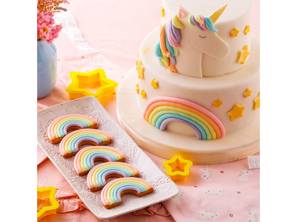 Egyszarvú formájú kiszúró. Használhatja linzer, mézeskalács vagy teasütemények készítéséhez. Marcipán, fondant vagy más modellező anyag kiszúrására is alkalmas. A kész fondant dekorációval díszíthet szülinapi tortát vagy süteményeket.