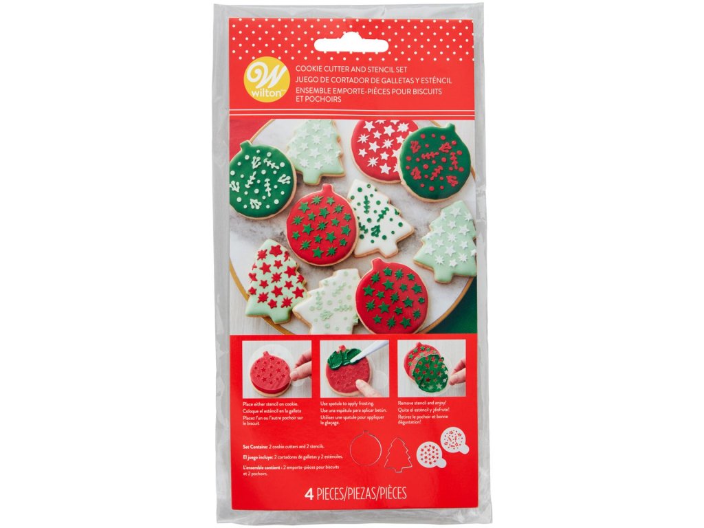 Kiszúró és és stencil készlet. A kivágott termékek tökéletesen díszítik az eredeti karácsonyi desszerteket. Használja őket házi linzer sütemények, mézeskalácsok és keksz készítéséhez. A vágó alkalmas fondant vagy marcipán kivágására is. Felvágás és sütés után a kész péksüteményt stencil segítségével díszíthetjük.