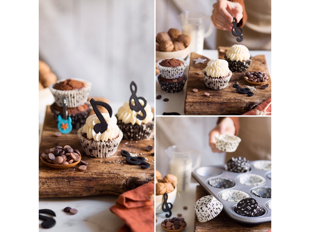 Szerezzen örömöt egy zenekedvelőnek és színesítse a születésnapi partit vagy más partit ezekkel a eredeti kiegészítőkkel. A zene motívummal ellátott papír kosárkákat használhatja muffinokhoz vagy más édességhez.