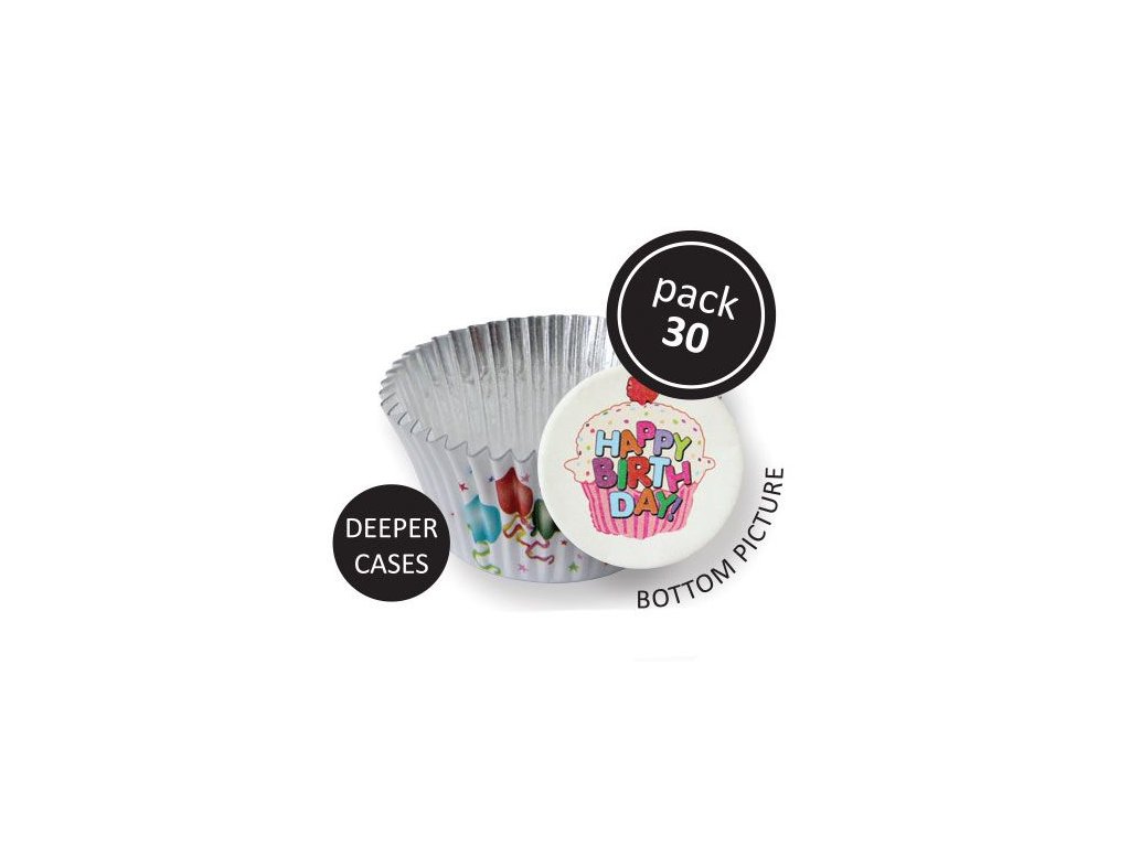 Eredeti muffin kosárkák születésnapi motívummal, amelyek alkalmasak muffinok, cupcake-ek, praliné és egyéb édességek sütésére. Az optimális eredmény érdekében használjon muffin formát