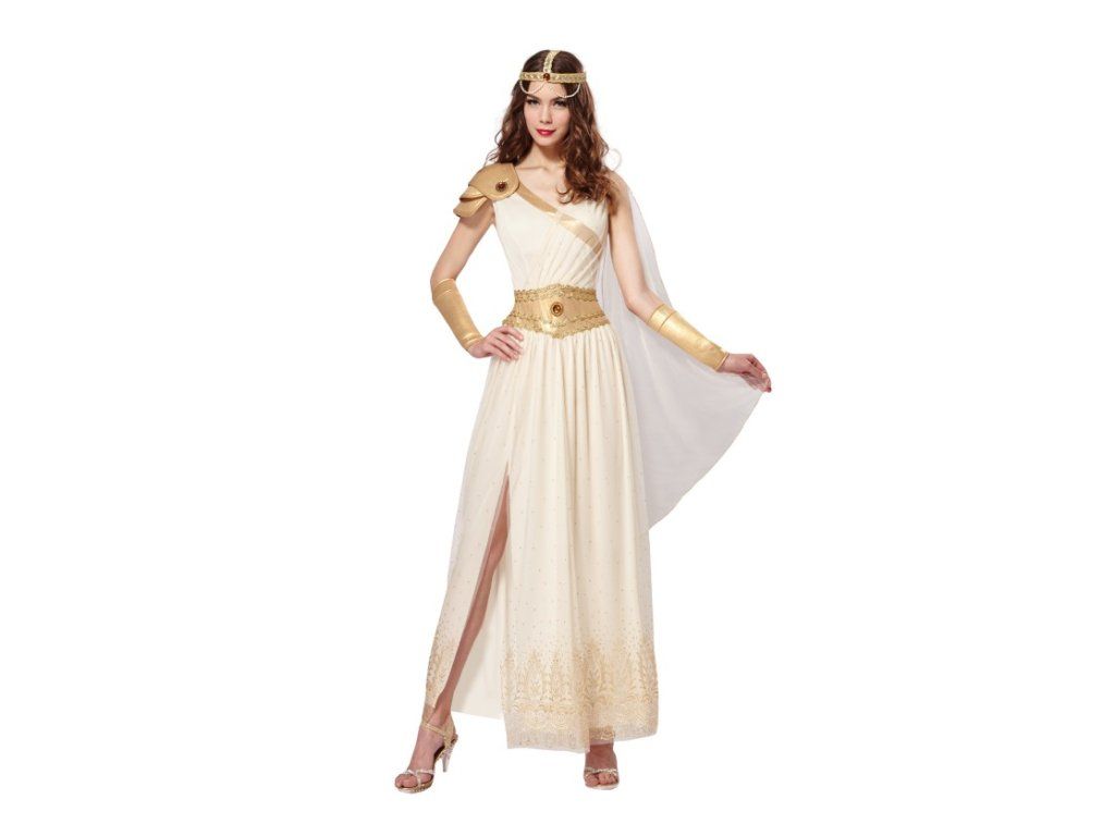 Elbűvölő ókori istennői jelmez, amely elrepíti a görög mitológia világába. Az aszimmetrikus szabás, egyetlen pánttal és diszkrét hasítékkal kiemeli a nőiességet és bájt. Az arany öv szépen formálja a testet, melyet stílusos karkötők és díszes mintákkal ellátott hajpánt egészítenek ki. A közepes hosszúságú áttetsző köpeny pedig fenségességet kölcsönöz. Ez a jelmez tökéletes választás farsangra, tematikus partikra vagy történelmi témájú rendezvényekre. Lépjen ki a tömegből, és váljon ellenállhatatlan istennővé!