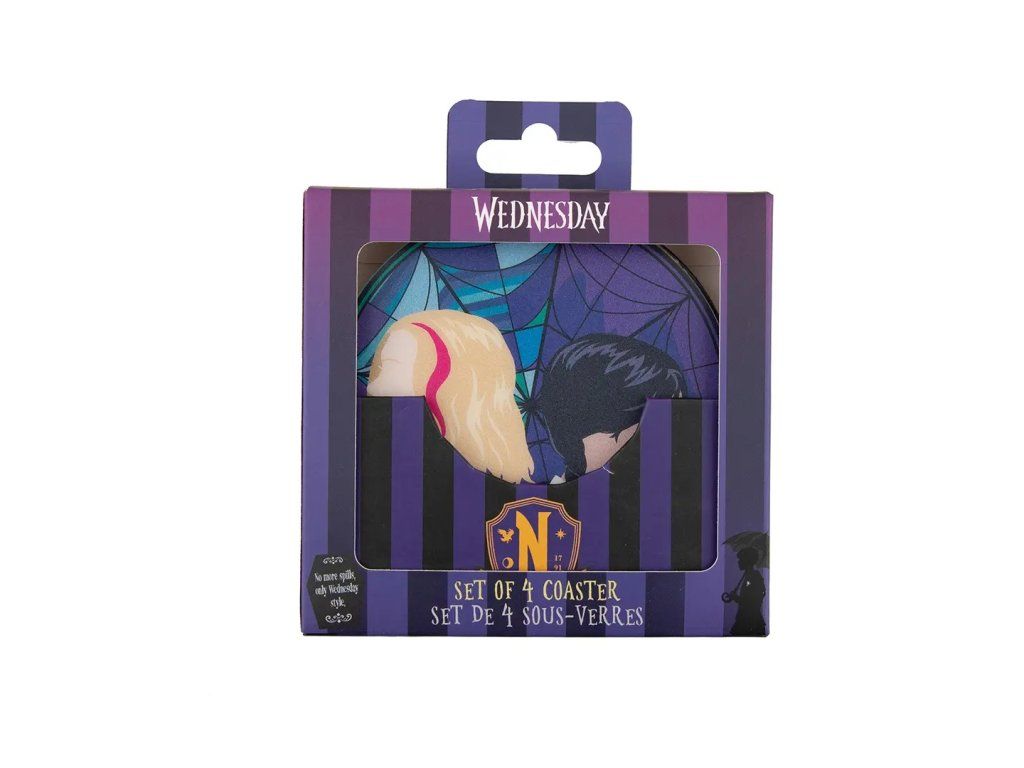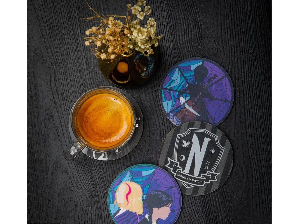 A készletben négy alátét található a Wednesday című népszerű sorozat témájával. A nyomtatott alátétek tökéletes ajándékok lesznek a sorozat rajongóinak.