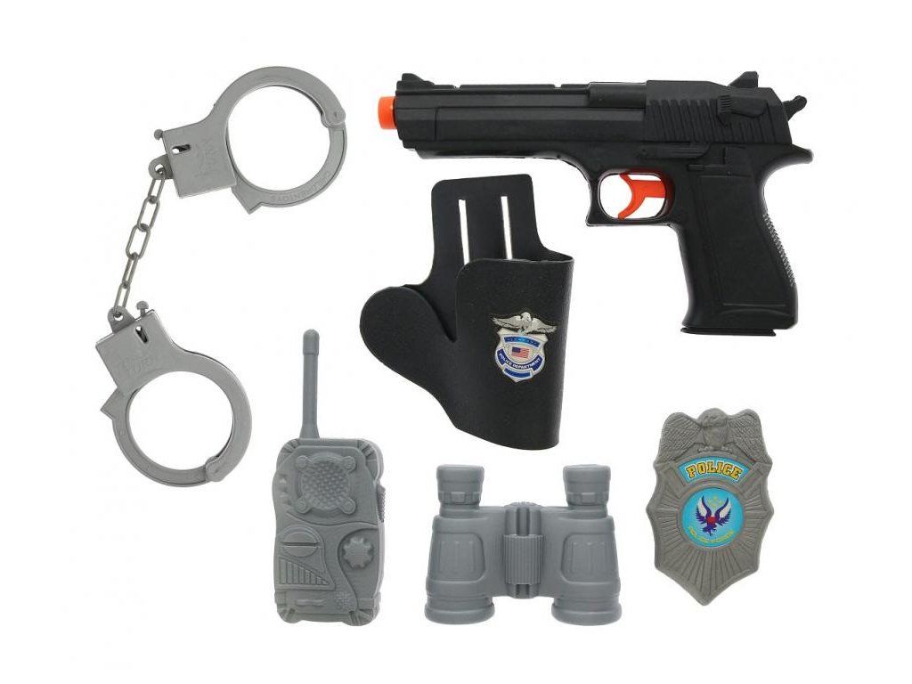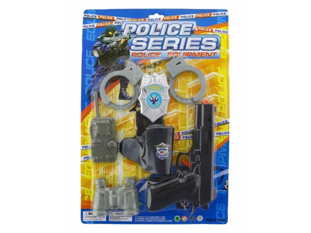 rendőrpisztoly utánzat, rendőrjelvény, bilincs, távcső, rádió és pisztolytartó
