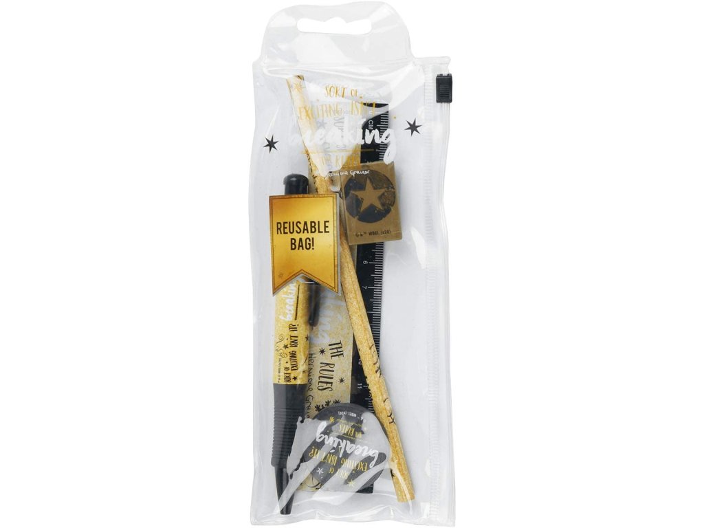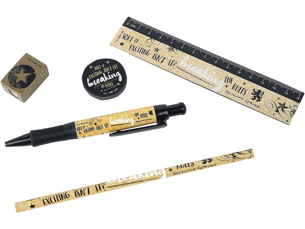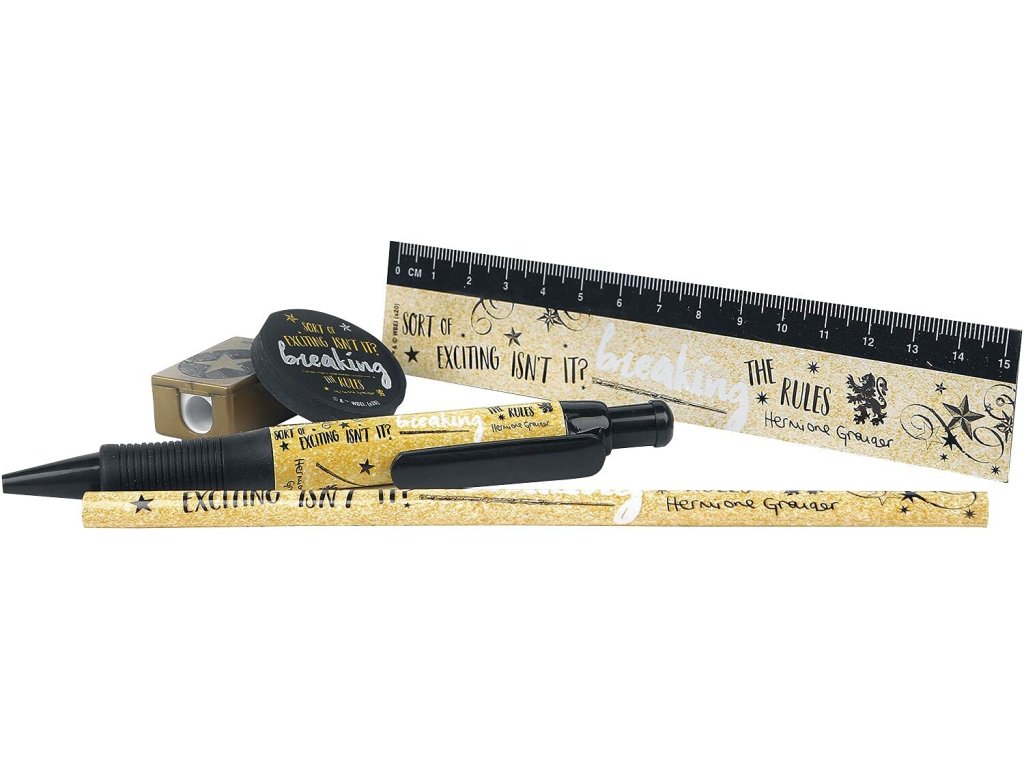 Písacie potreby v dizájne Hermiony, bude perfektne zdobiť zbierku každého milovníka príbehov o Harrym Potterovi. Obsahuje aj meno Hermiony Grangerovej - ručne napísané na pere, ceruzke a pravítku spolu s čmáranicami chrabromilského leva, hviezdami a čarovným prútikom.