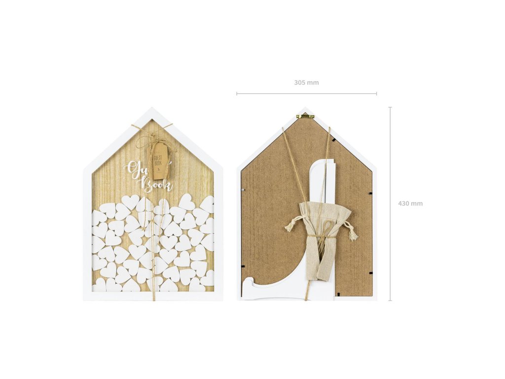 Ez a fából készült, ház alakú vendégkönyv szebbé teszi az esküvő napját. A könyv 50 szívet tartalmaz, amelyeket a vendégek aláírhatnak.
