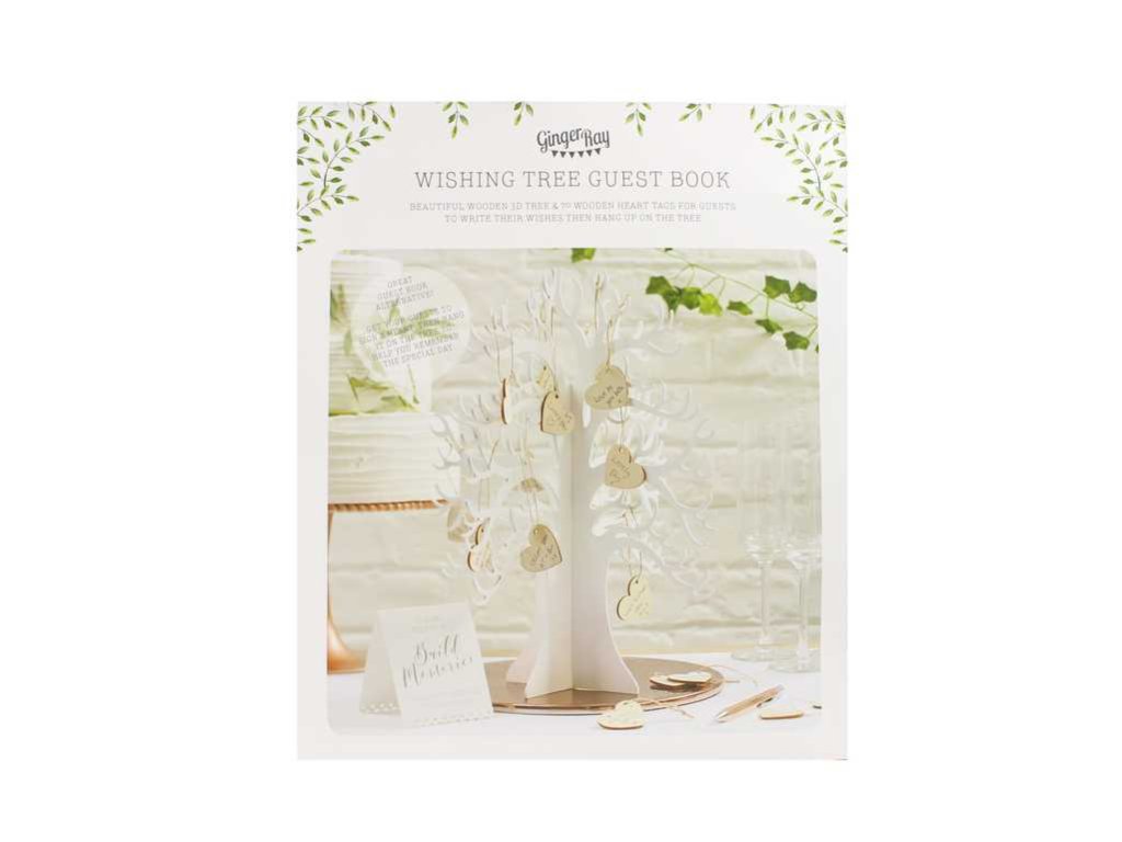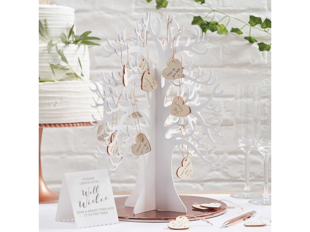 A gyünyörű fehér fához 70 üres fa szív tartozik, ahová a vendégeik leírhatják jókívánságukat, majd felakaszthatják a fára. Minden fa szívben van egy lyuk és egy madzag amivel felakaszthatják.